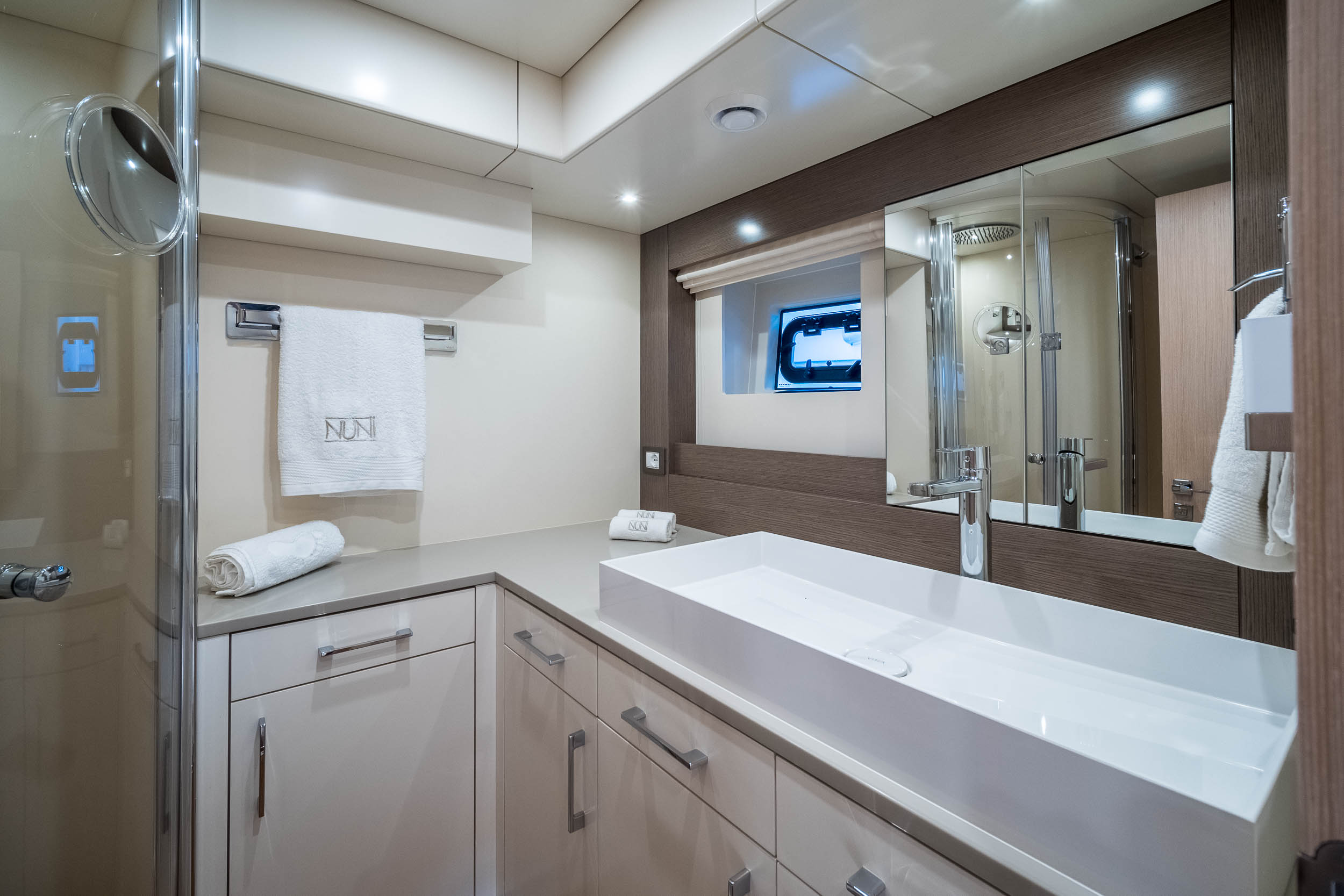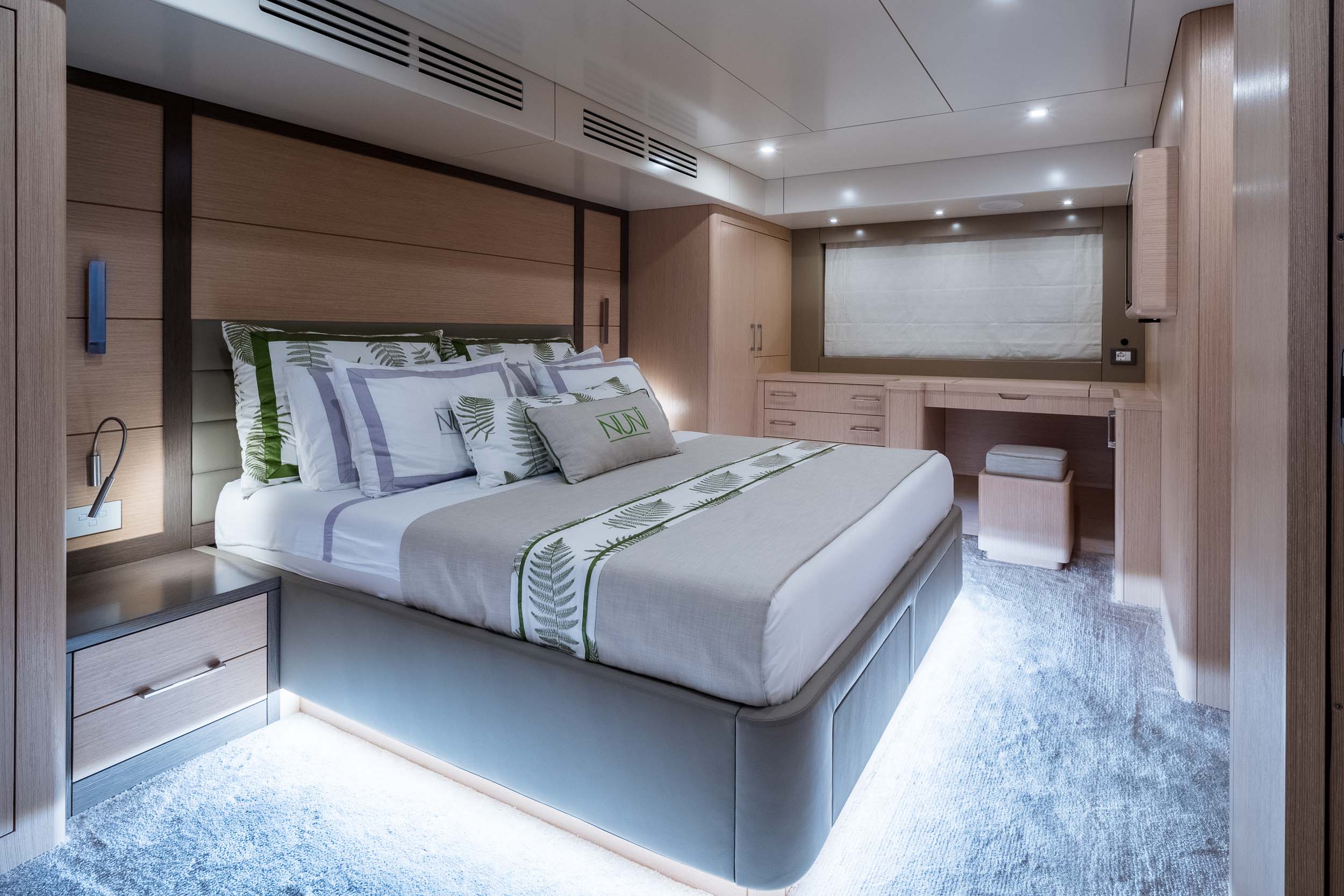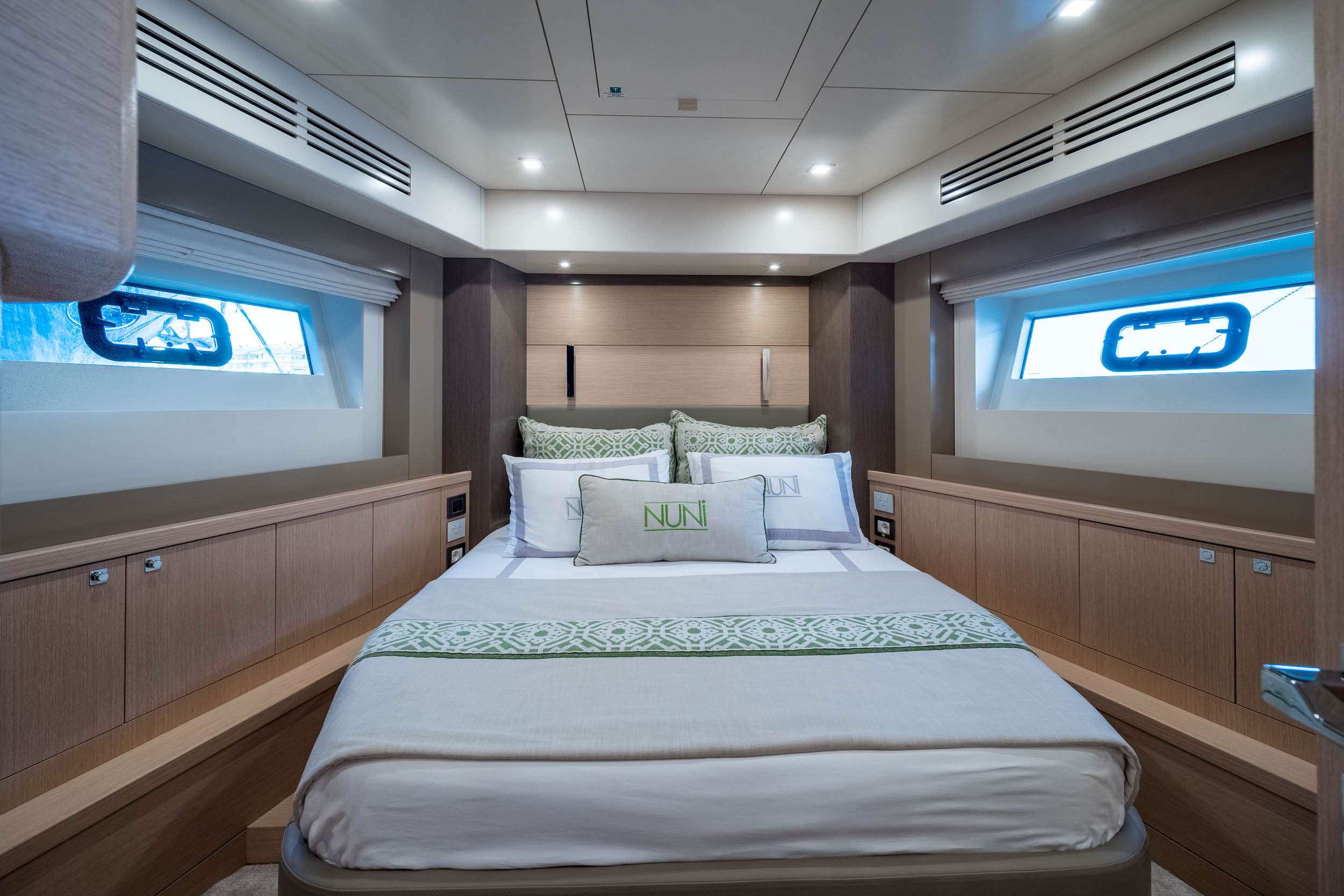 El camarote principal a toda manga, ubicado en el centro del barco, destaca por su amplitud y elegancia, incorporando materiales de primera calidad, detalles en madera natural y textiles selectos. Acompañado de camarotes adicionales y espacios versátiles, el interior ofrece privacidad, funcionalidad y estilo para todos los huéspedes a bordo.