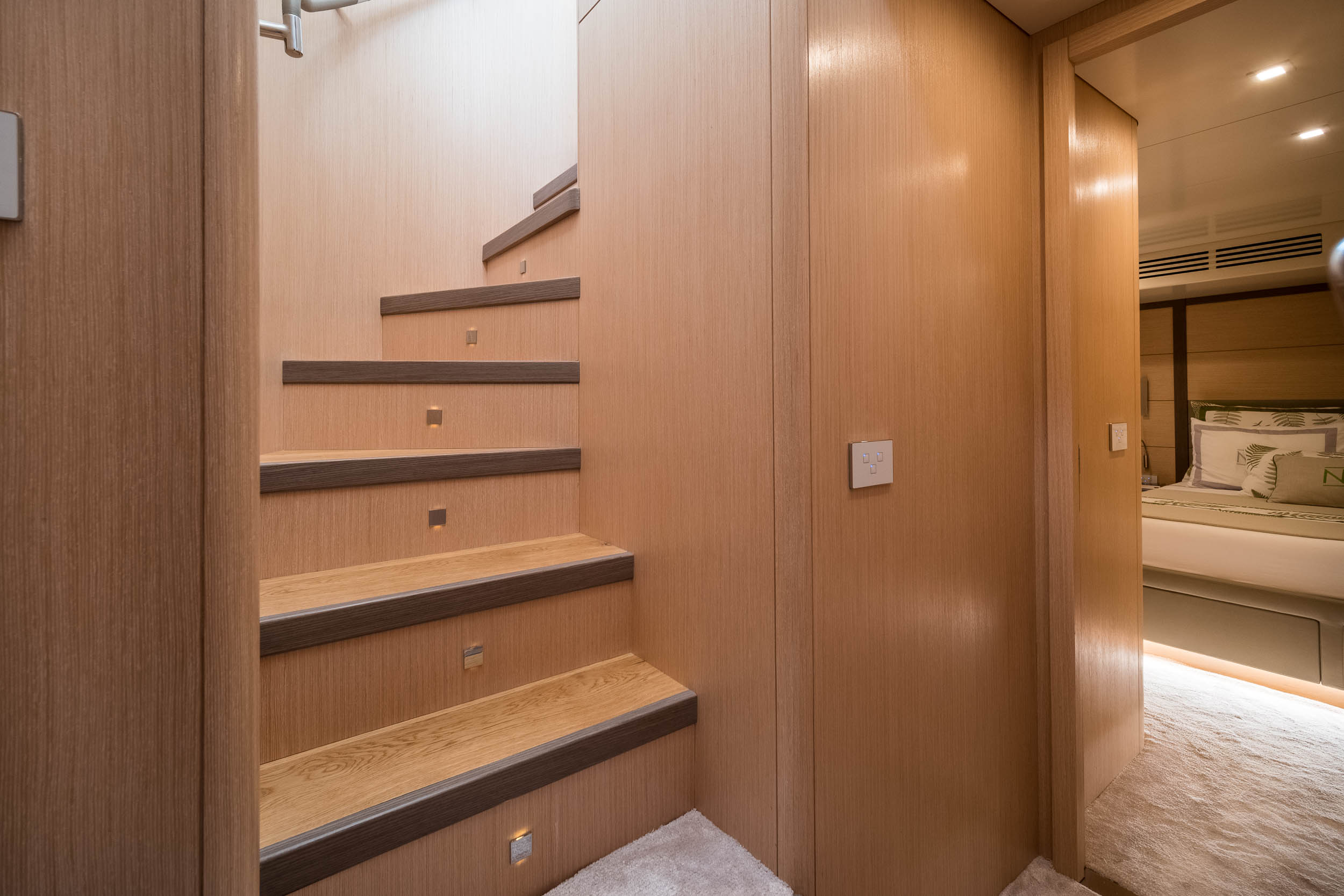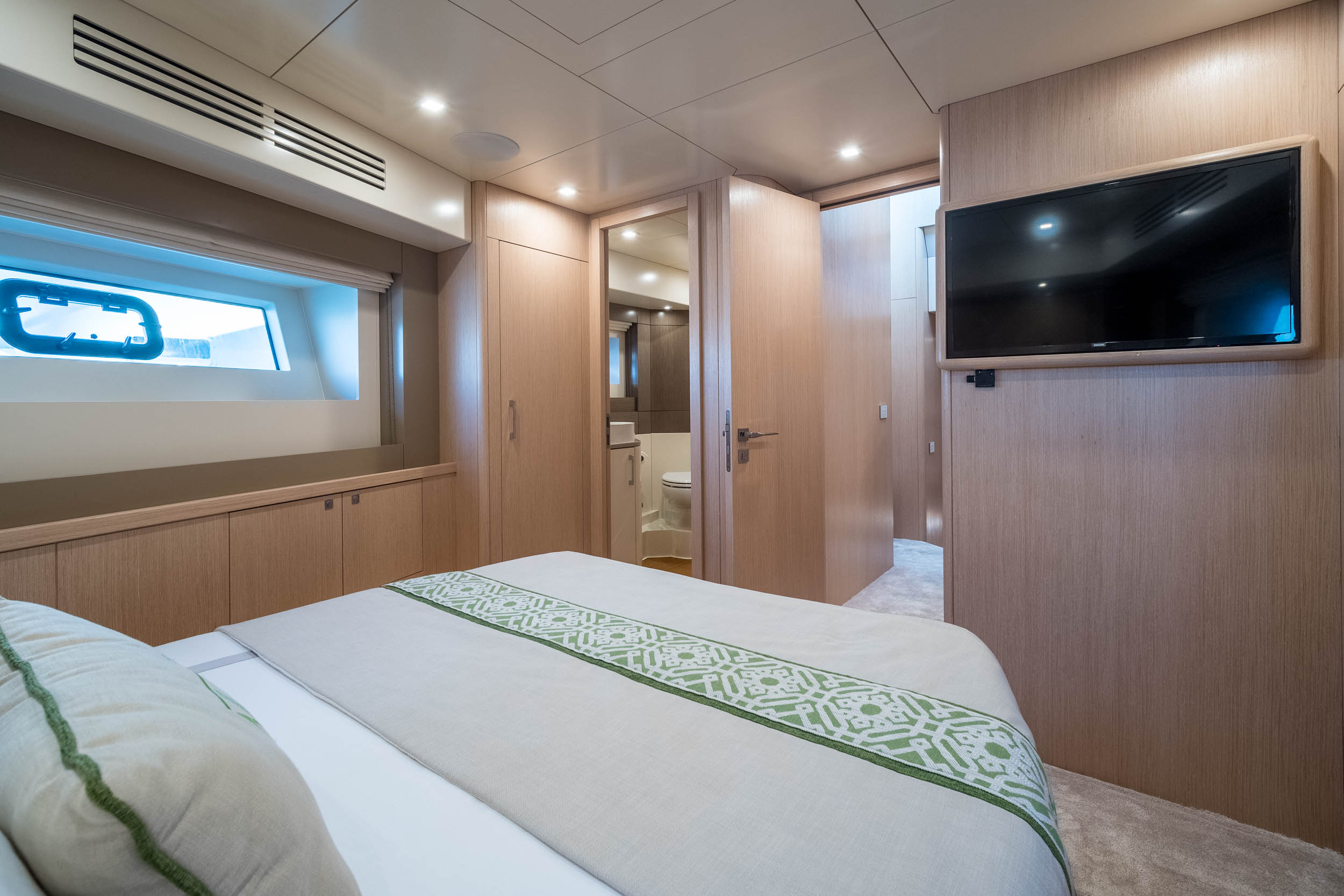 The full-beam master cabin, located midship, stands out for its spaciousness and refined elegance, featuring high-quality natural wood finishes, luxurious textiles, and meticulous craftsmanship. Complemented by additional cabins and versatile living spaces, the interior offers privacy, functionality, and style for all guests aboard.