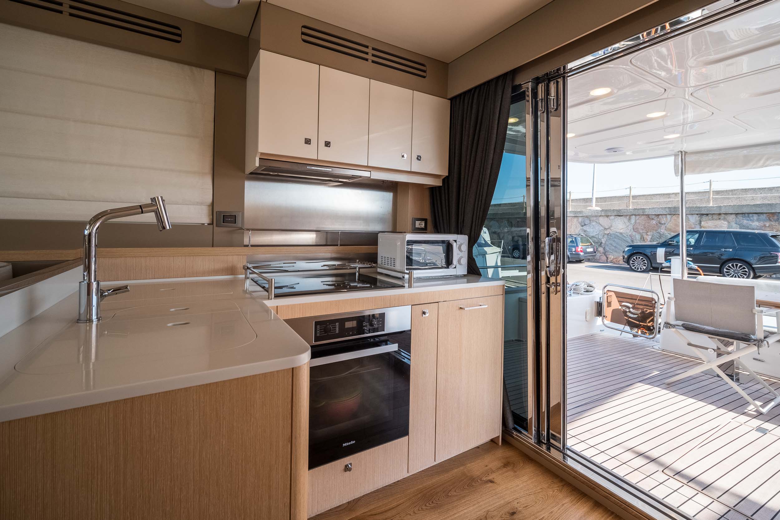 Outside, expansive deck areas invite you to enjoy the open air. From the generous flybridge to the spacious foredeck and aft cockpit, the Sirena 58 offers multiple spots to relax, sunbathe, or enjoy al fresco dining while taking in breathtaking panoramic sea views.