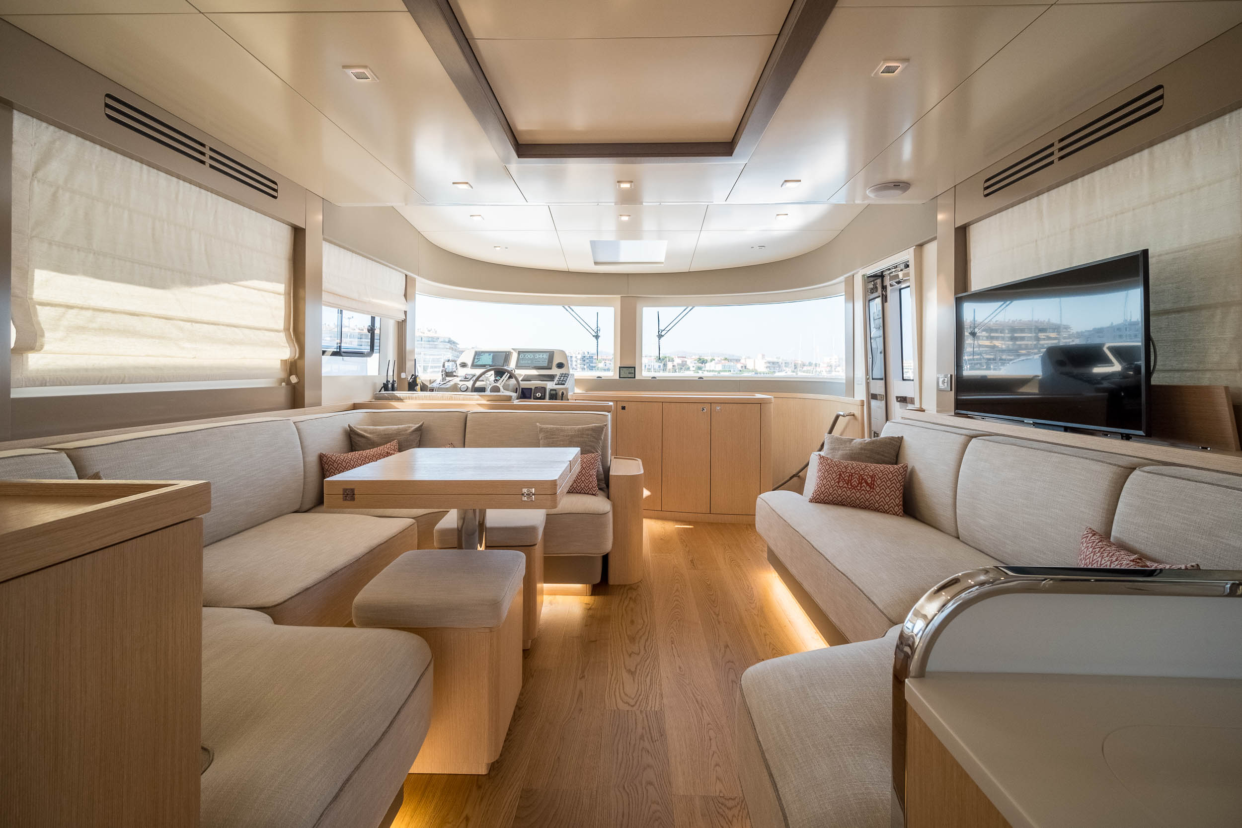 El volumen del Sirena 58 es notable para su eslora de 18 metros, ofreciendo interiores más amplios y abiertos que los habituales en embarcaciones de este tamaño. Cada rincón ha sido cuidadosamente diseñado para maximizar la luz natural, las líneas de visión despejadas y la comodidad, logrando un ambiente que recuerda al de yates de mayores dimensiones.