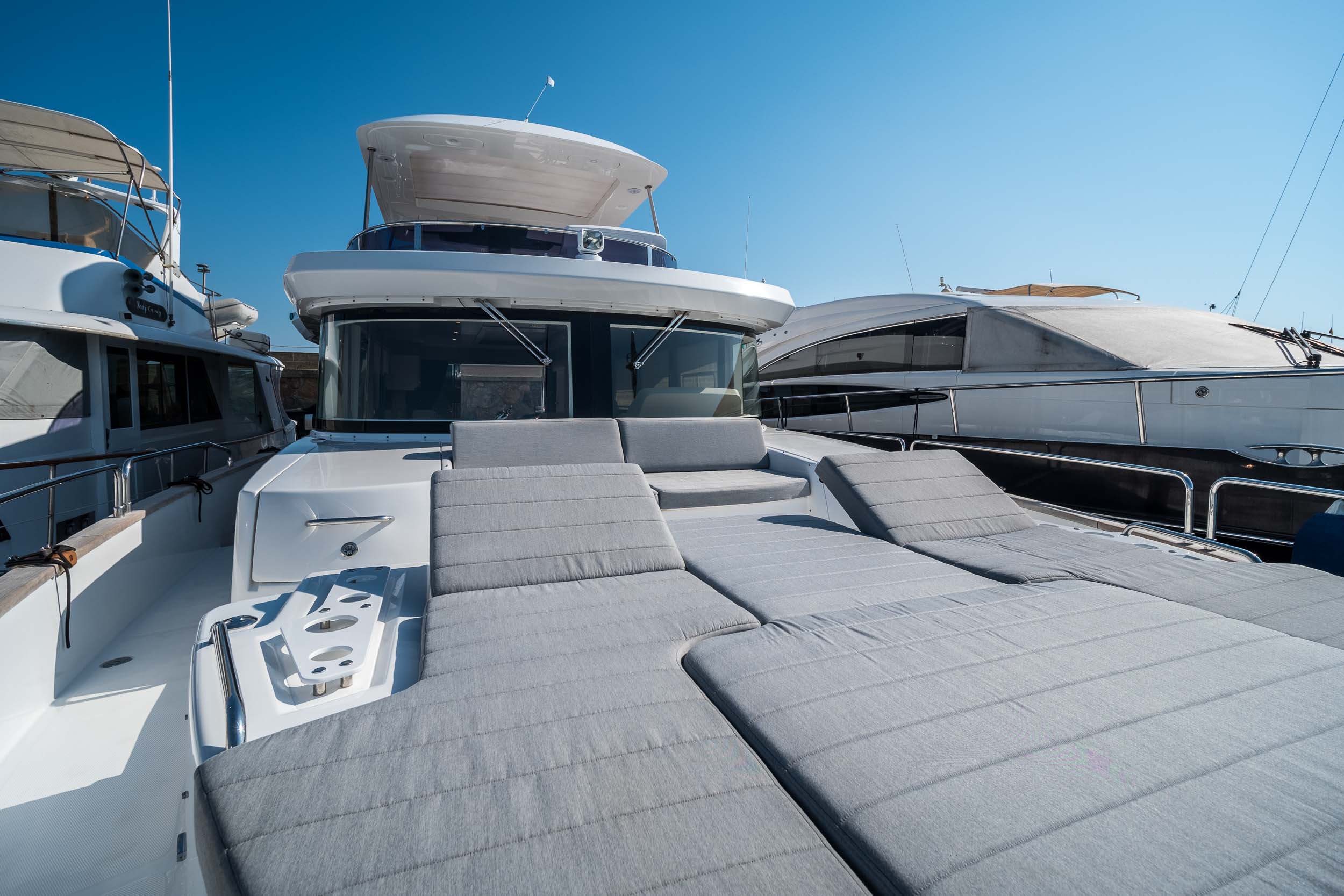 En el exterior, las áreas de cubierta invitan a disfrutar del aire libre. Desde el amplio flybridge hasta la zona de proa y el espacioso cockpit, el Sirena 58 ofrece múltiples opciones para relajarse, tomar el sol o disfrutar de cenas al aire libre, todo mientras se contemplan vistas panorámicas del mar.